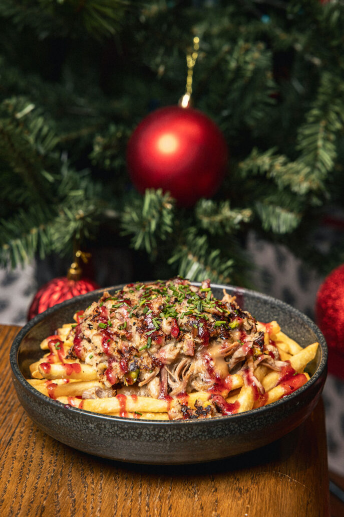fries, pulled confit turkey in homemade gravy, pork stuffing, cranberry sauce and chives.