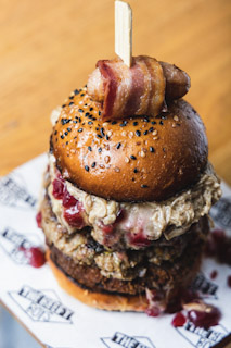 beef patty, pork stuffing patty, bubble and squeak patty, ‘gravy moist maker’, pulled confit turkey, jack cheese, cranberry sauce, homemade gravy and a pig in blanket on top!